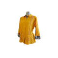 Guayabera cubana mostaza de dama combinada, en manga 3/4 de lino flame, hecha en Tekit, Yucatán, Precios directos de fabrica. Hecha en Tekit Yucatán. Pídela en manga corta o manga larga. Contamos con prendas para entrega inmediata.